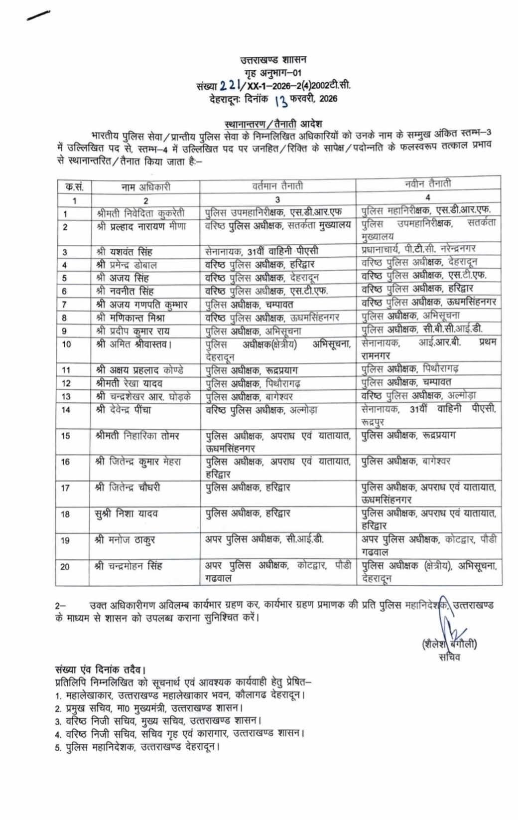 सचिव शैलेश बगौली द्वारा जारी आदेश में स्पष्ट किया गया है कि सभी संबंधित अधिकारी अविलंब अपनी नई तैनाती स्थल पर कार्यभार ग्रहण करेंगे। साथ ही, कार्यभार ग्रहण प्रमाणक की प्रति पुलिस महानिदेशक (DGP) के माध्यम से शासन को उपलब्ध कराना सुनिश्चित करेंगे।